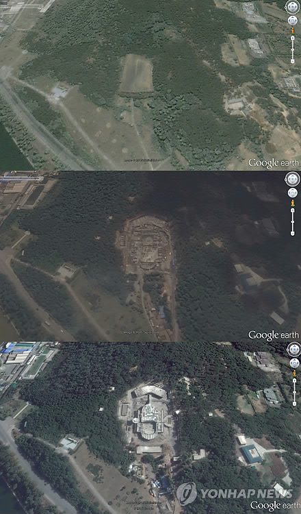 | △ 구글어스의 위성사진을 판독한 결과 북한이 5월3일 공개한 국가우주개발국 위성관제종합지휘소가 평양 도심의 보통강구역 서재골에 위치한 것으로 확인됐다. 맨 위 사진은 2000년 6월 지휘소가 건설되기 이전의 서재골 전경. 가운데 사진은 2014년 7월 건설 중에 있는 지휘소 모습. 맨 아래 사진은 완공되기 7개월 전인 2014년 9월 찍은 지휘소 사진이다.2015. 5.5 nkphoto@yna.co.kr < 위 사진 크레디트는 (구글/연합뉴스)로 표기해야 하며 뉴스보도 목적으로만 사용가능(판매금지) 합니다.> |