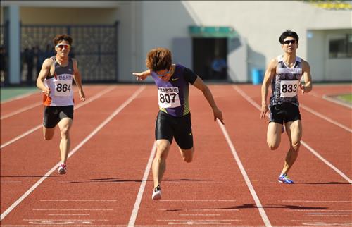 | △ 김국영(가운데)이 5일 경상북도 김천종합운동장에서 열린 제44회 전국종별육상경기선수권대회 남자 일반부 200m에서 20초83의 기록으로 결승선을 통과하고 있다. <<대한육상경기연맹 제공>> |