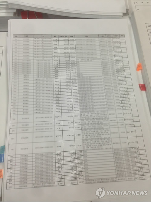 | △ 제약사로부터 리베이트 받은 의사 명단 (수원=연합뉴스) 경기지방경찰청 지능범죄수사대는 성남시 소재 A제약회사가 의사들에게 수십억원대의 리베이트를 제공했다는 첩보를 입수, 해당 업체 대표와 법인, 의사 10여명 등을 불구속 입건했다. 사진은 경찰이 지난 1월 해당 업체를 압수수색해 확보한 전산서버에서 나온 병원과 의사 이름이 적힌 리베이트 액수 내역으로, 경찰은 관련 의사들이 수백명에 달하는 것으로 보고 수사를 확대하고 있다.2015.5.6<<경기청 제공>> |