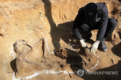 | △ 한국과 미국이 6·25전쟁 당시 미군 '킨 특수임무부대'와 북한군이 치열한 전투를 벌였던 경남 창원시 마산합포구 진전면 임곡리 야산 일대에서 공동으로 전사자 유해 발굴에 나선다. 사진은 지난 2011년 3월 경남 창원시 마산합포구 진전면 인성산 5부능선에서 국방부 유해발굴감식단원이 국군의 유해를 발굴하는 모습. (연합뉴스 자료사진) |