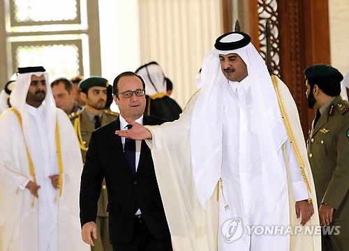 | △ (도하 AP=연합뉴스) 타밈 빈 하마드 알타니 카타르 왕세자가 4일(현지시간) 카타르 왕궁인 에미리 디완 궁에서 프랑수아 올랑드 프랑스 대통령을 영접하고 있다. 올랑드 대통령은 카타르와 70억 달러 규모의 전투기 판매 계약에 서명했다. |