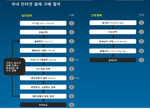 종전에 일반결제 방식은 로그인에서 결제완료까지 대략 10단계였다. 온라인 구매에 나선 이용자가 공인인증서가 없을 경우에는 은행 등에서 새로 발급받아 결제과정을 다시 밟아야했던 탓에 번거로움이 적지 않았다.
