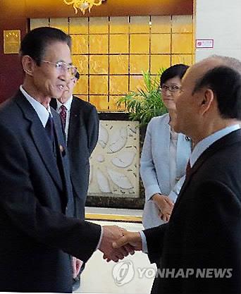 | △ 6.15 공동선언 15주년 기념 공동행사 개최를 위한 민간 차원의 남북 사전 접촉이 하루 연장됐다. 사진은 지난 5일 남측 대표인 이창복 공동행사 준비위 상임대표의장과 북측 대표인 김완수 6·15공동선언실천 북측위원회 위원장이 사전 접촉 장소인 중국 선양의 한 호텔에서 만나 악수하는 장면. 2015.5.6 realism@yna.co.kr |