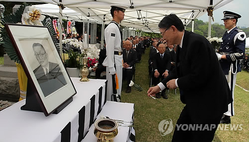 | △ 지난해 5월8일 서울 동작동 국립서울현충원 애국지사 묘역에서 열린 고하(古下) 송진우 선생 탄신 124주년 추모식에서 유족 대표인 장손 송상현 국제형사재판소장 겸 서울대 명예교수가 영정 앞에 헌화하는 모습. hihong@yna.co.kr |