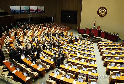 | △ 4월 임시국회에서 공무원연금 개혁안 처리가 무산된 6일 밤 새누리당 의원들이 국회 본회의장을 떠나고 있다. |