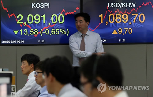 | △ 증시 부진 속 원화 값 급락 (서울=연합뉴스) 신준희 기자 = 대내외 투자 환경 악화 속에 외국인마저 '팔자'로 돌아서면서 코스피지수가 7일 2,100선 아래로 밀려나 전 거래일보다 13.58포인트(0.65%) 하락한 2,091.00으로 장을 마쳤다. 한편, 달러화에 견준 원화 값이 글로벌 증시 부진 속에 급락했다. 이날 원·달러 환율은 전일 종가보다 9.7원 오른 1,089.7원에 거래가 끝났다. 사진은 이날 오후 서울 명동 외환은행 본점 딜링룸. |