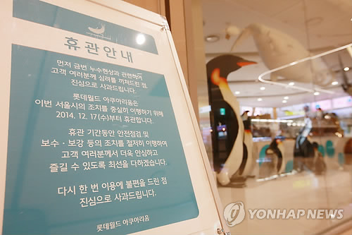 | △ 제2롯데 재개장 허용 '가닥'…내일 공식발표 (서울=연합뉴스) 박동주 기자 = 7일 오후 서울 송파구 롯데월드몰 아쿠아리움 인근에 휴관 관련 안내문이 설치되어 있다. 서울시는 5개월 가까이 사용이 중단된 제2롯데월드 수족관과 영화관에 대해 전문가 최종 자문을 마치고 8일 재개장 허가를 발표하는 것으로 가닥을 잡았다. |