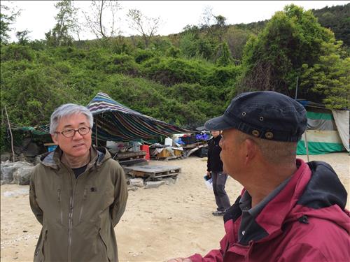 | △ 김종덕 문체부 장관(왼쪽)이 7일 덕적도 으름실공동체 주민으로부터 마을 현황에 대한 설명을 듣고 있다. |