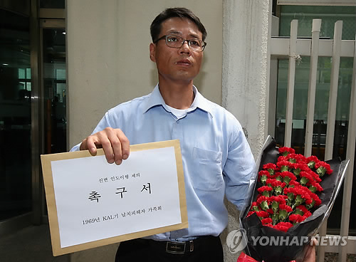 | △ (서울=연합뉴스) 황광모 기자 = 1969년 대한항공(KAL) YS-11기 납북사건 피해자 가족회 회장인 황인철씨가 어버이 날인 8일 오전 서울 세종로 정부서울청사 후문에서 통일부에 전달할 탄원서와 카네이션을 들고 기자회견을 하고 있다. 황씨는 "정부가 항공기의 불법 납치 억제를 위한 협약에 따라 북한에 납북자 인도를 촉구해야 한다"며 통일부 장관에게 아버지에게 달아주지 못했던 카네이션을 대신 전달했다. 황씨의 아버지 황원(당시 32세)씨는 출장차 KAL기에 올랐다가 고정간첩에 의해 납치돼 46년간 남한으로 돌아오지 못하고 있다. 2015.5.8 hkmpooh@yna.co.kr |
