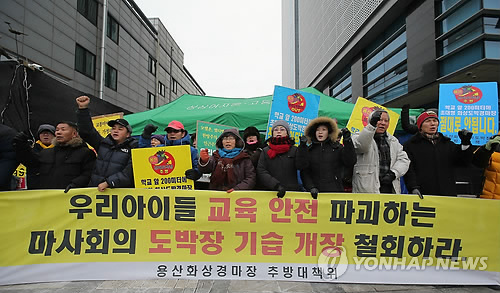 | △ 지난해 12월 용산 화상경마도박장 추방대책위 관계자들이 서울 용산구 청파로 화상경마장 앞에서 기자회견을 열고 마사회의 정식 개장 강행 움직임에 대하여 규탄하고 폐쇄를 촉구하고 있다. (연합뉴스 자료사진) |