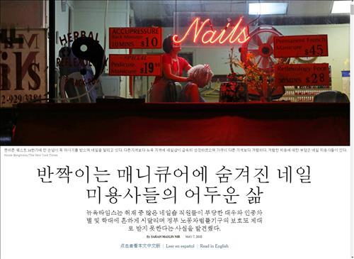 (뉴욕·서울=연합뉴스) 박성제 특파원 장재은 기자 = 미국의 일간지 뉴욕타임스가 7일(현지시간) 한국인이 주도하는 미국 네일살롱의 노동착취와 차별을 고발했다.