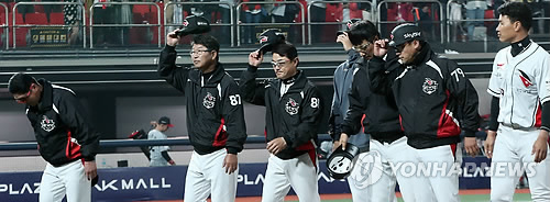 | △ 케이티, 창단 첫 3연승 (수원=연합뉴스) 신영근 기자 = 8일 경기도 수원케이티위즈파크에서 열린 프로야구 케이티 위즈와 LG 트윈스의 경기에서 7대3으로 승리, 창단 첫 3연승에 성공한 케이티 조범현 감독(왼쪽)과 코치, 선수들이 경기 후 팬들에게 인사하고 있다. 2015.5.8 drops@yna.co.kr |