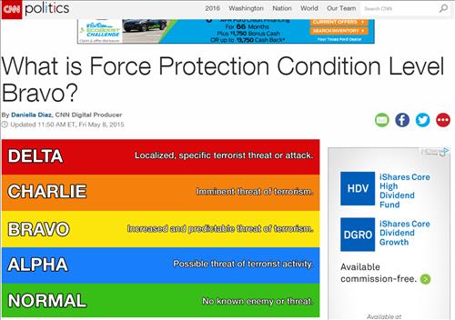 '브라보'는 '점증하고 예측할만한 테러 위협'에 대응하는 단계로, 미국 국방부가 5개로 구분한 테러 경계수위 중 세 번째에 해당한다.