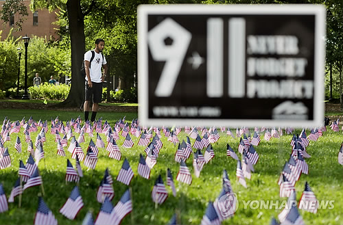 | △ 미국 테러 전문가가 '이슬람국가'(IS)가 수년 내에 미 본토를 겨냥해 '9·11 테러'에 버금가는 대규모 테러를 자행할 수도 있다고 지적했다. 사진은 9·11테러 13주년인 지난해 9월, '그날의 희생자들'을 상징하는 소형 성조기들이 꽂혀 있는 미국 조지아공대 교정. Geoving Gerard, 20, of Atlanta, looks over some 3,000 flags representing each life lost in the Sept. 11, 2001 attacks as they stand on display to commemorate the 13 anniversary of the attacks, at Georgia Tech University, Thursday, Sept. 11, 2014, in Atlanta. (AP Photo/David Goldman) |