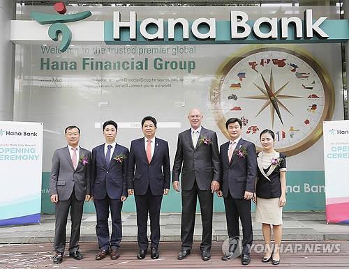 | △ (서울=연합뉴스) 하나은행은 베트남 최대 경제 중심지인 호찌민시에 '호찌민지점'을 개설하고 7일 새로운 출발을 기념하는 기념행사를 가졌다. 김병호 하나은행장(왼쪽 세번째)을 비롯한 참석 내외빈이 호찌민시의 랜드마크인 통일궁 근처 중심가 교차로에 위치한 호찌민지점 앞에서 현판식을 갖고 기념사진 촬영을 하고 있다. 2015.5.7 << 하나금융그룹 제공 >> photo@yna.co.kr |