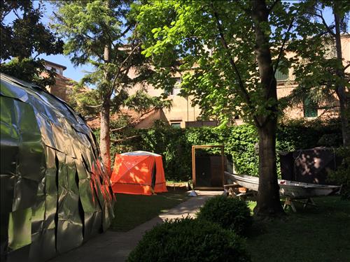 정원에는 화분이 놓여 있는 배가 놓여 있는가 하면 텐트처럼 보이는 설치물이 다양한 형식으로 구성돼 있다.