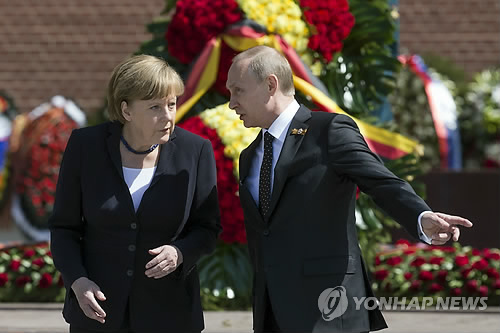 메르켈 총리는 그러나 전날 군사 퍼레이드 등 주요 행사 대신 이날 별도로 무명용사 묘지에 참배하고 블라디미르 푸틴 대통령과 따로 회동하는 '나 홀로 동선'을 밟았다.