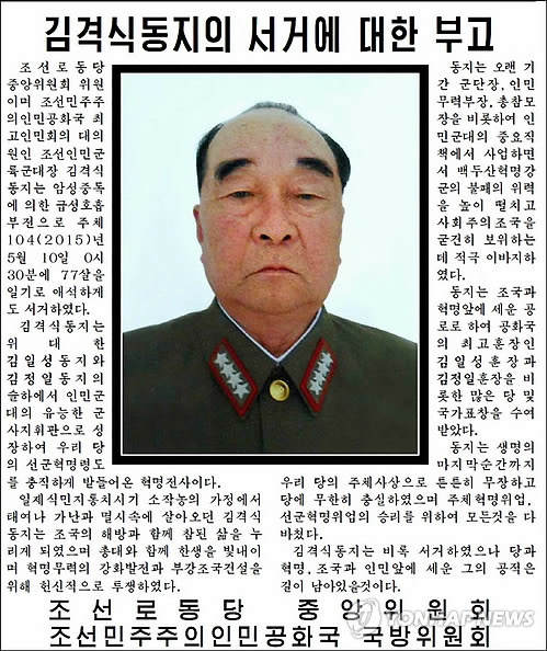 | △ 김격식 북한 전 인민무력부장 사망 (서울=연합뉴스) 북한 인민무력부장을 역임한 김격식(77) 인민군 대장이 사망했다고 북한 노동당 기관지 노동신문이 11일 보도했다. 사진은 노동신문에 실린 김격식의 부고다. 김격식 전 부장은 북한 군부내 대표적인 강경파 인물로 4군단장이었던 지난 2010년 천안함 폭침사건을 주도한 배후로 지목된 인물이다. 2015.5.11 nkphoto@yna.co.kr |