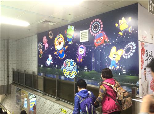시는 국산 애니메이션 '뽀롱뽀롱 뽀로로'의 제작사인 아이코닉스의 투자를 받아 명동역사 내 뽀로로 캐릭터 이미지 32컷을 우선 설치했고, 앞으로 이미지와 조형물을 추가로 설치할 예정이다.