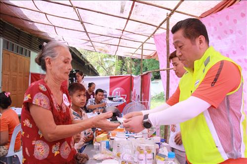 | △ LG전자가 9~10일 미얀마 외곽의 위생 취약 지역인 ‘타토(Thahto)’ 에서 양곤의학대학 출신 현지 의료진과 협력해 현지 주민 3,500여 명에게 무료 검진을 제공했다. 사진은 현지 주민에게 의약품을 전달하고 있는 배상호 노조위원장(오른쪽). |