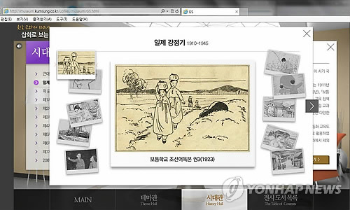 | △ 근대교과서 발행 120주년 온라인 전시 열려 (서울=연합뉴스) 최초의 근대 교과서 '국민소학독본' 발행 120주년을 맞아 교과서의 변천을 살필 수 있는 온라인 전시가 마련된다. 금성출판사는 '삽화로 보는 시대 문화 컬렉션' 기획전을 인터넷 웹사이트(museum.kumsung.co.kr)에서 무료로 한다고 11일 밝혔다. 사진은 시대관 '일제 강점기' 관련 삽화. (웹사이트 museum.kumsung.co.kr 캡처) |