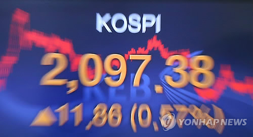 이날 코스피는 전 거래일보다 11.86포인트(0.57%) 오른 2,097.38로 장을 마쳤다.