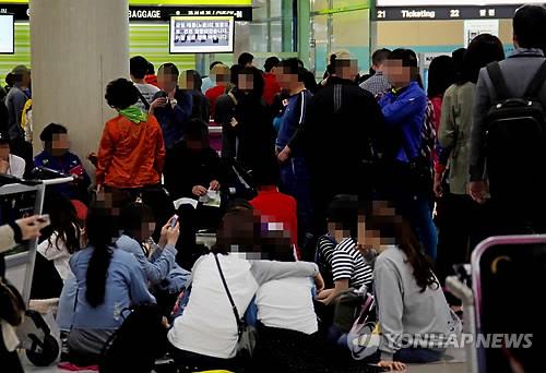 | △ 제주공항 결항 속출…주저앉은 이용객 (제주=연합뉴스) 고성식 기자 = 11일 오후 제주공항에 강풍과 윈드시어 특보가 내려져 항공기 결항이 속출한 가운데 몇몇 이용객들이 '전편이 결항됐다'고 안내문을 표출한 한 항공사의 발권 데스크 앞에 주저앉아 있다. |