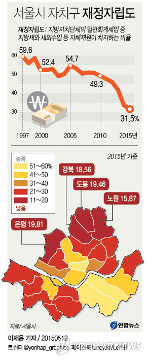 25개 구의 재정자립도는 1995년 지방자치제도 시행 이후 꾸준히 50%를 웃돌다가 2010년 49.3%, 2011년 47.7%, 2012년 46.0%로 급락했다. 자치구들의 재정자립도는 2013년 41.8%에서 2014년 33.6%까지 떨어졌다.