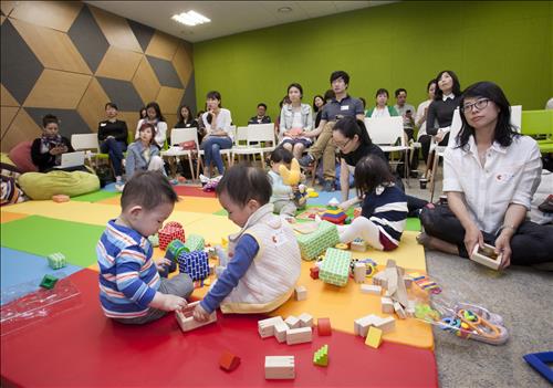 엄마나 아빠가 수업을 듣는 강의실에는 아기들이 놀 수 있는 매트와 장난감도 제공된다.