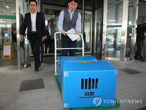 | △ 검찰, 한국석유공사 본사 압수수색 (울산=연합뉴스) 김용태 기자 = 검찰이 한국석유공사를 전격 압수수색한 12일 오후 울산시 중구 우정동 한국석유공사 본사에서 검찰 관계자들이 압수품이 든 상자를 가지고 나오고 있다. |