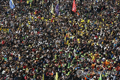 | △ '세월호 1주년' 이후 첫 주말 집회 (서울=연합뉴스) 박동주 기자 = 18일 오후 시청 앞 서울광장이 '세월호참사 범국민대회' 참석자들로 가득하다. 2015.4.18 pdj6635@yna.co.kr |