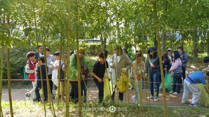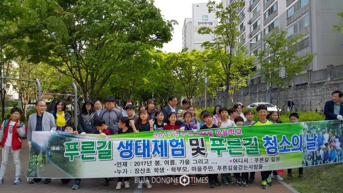 광주광역시 남구 장산초등학교가 4월 26일 광주남구의 마을교육공동체인 '푸른길 달빛 마을학교'가 장산초등학교 학부모, 교사, 마을주민들과 함께 푸른길 생태체험과 청소의 날 행사를 가졌다.