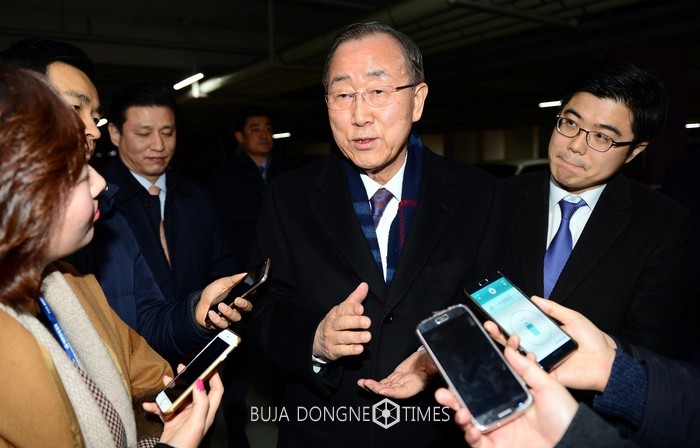 대선불출마를 선언한 반기문 전 유엔사무총장이 1일 오후 서울 동작구 사당동 자택입구에서 취재진의 질문에 답변하고 있다. 2017.02.01.