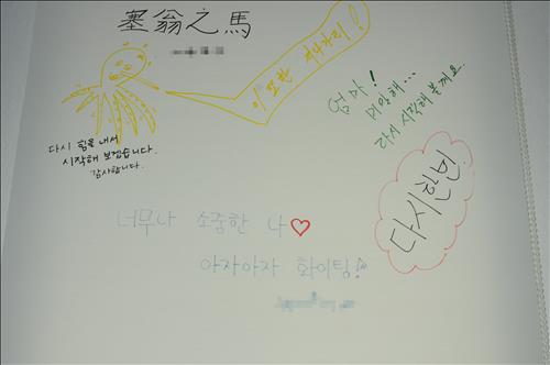 '인생사 새옹지마', '이 또한 지나가리', '엄마! 미안해…다시 시작해 볼게요', '다시 힘을 내서 시작해 보겠습니다. 감사합니다', '너무나 소중한 나♡ 아자아자 화이팅!' 등 상담 후 달라진 마음가짐을 표현한 글들이다.