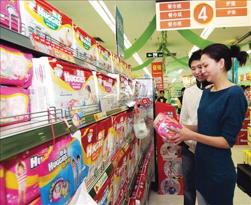 | △ 중국 상하이의 한 대형매장에서 하기스 기저귀를 살펴보는 중국인 부부의 모습. |