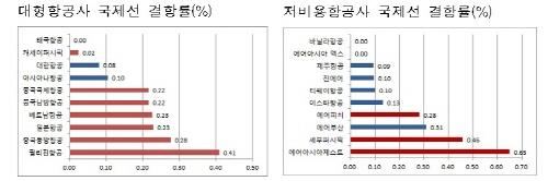 또 저비용항공사 중 국적 저비용항공사의 국제선 평균 지연율은 약 2.6%, 외국적 저비용 항공사는 5.7%로배 이상으로 차이가 났다.