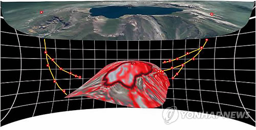 | △ (대전=연합뉴스) 한국 'CDP(국제대륙과학시추프로그램) 백두산 화산마그마연구그룹'(대표 이윤수 지질연 박사)이 화산분화 예측기술을 이용해 백두산 천지 아래 마그마의 거동을 예측해 그린 모식도. 2014.7.3. <<한국지질자원연구원>> jyoung@yna.co.kr |