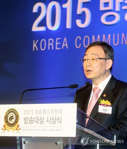 | △ 2015 방송통신위원회 방송대상 시상식 (서울=연합뉴스) 최성준 방송통신위원장이 20일 오전 서울 중구 소공동 롯데호텔에서 열린 '2015 방송통신위원회 방송대상' 시상식에서 인사말을 하고 있다. 2015.4.20 << 방송통신위원회 제공 >> photo@yna.co.kr |