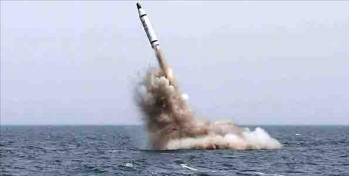 | △ 북한 전략잠수함서 탄도탄 '북극성' 발사 (서울=연합뉴스) 북한은 지난 9일 전략잠수함의 탄도탄 수중시험발사에 성공했다고 밝혔다. 사진은 북한 노동당 기관지 노동신문에 공개된 탄도탄 발사 모습. |
