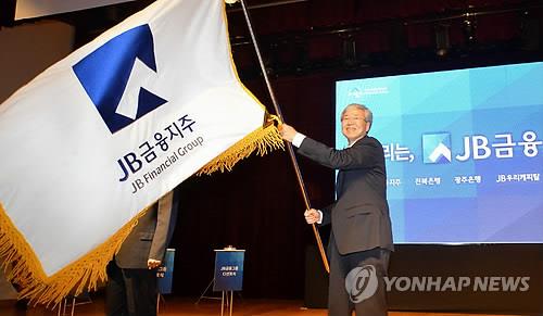 | △ (전주=연합뉴스) JB금융그룹은 3일 전북 전주시 금융지주 본사에서 종합금융그룹으로서 위상에 걸맞은 의미를 담은 통합 CI(기업이미지) 선포식을 했다. 김한 회장이 그룹 기를 흔들고 있다. 2015.4.3 <<전북은행>> |