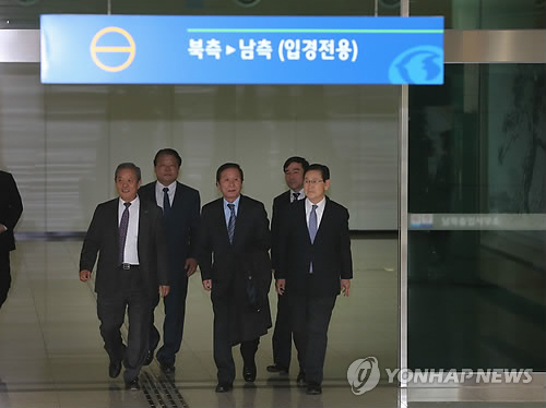 | △ 정기섭 개성공단기업협회장(가운데) 등 회장단 일행이 지난달 7일 경기도 파주시 경의선 남북출입사무소에서 입경하고 있다. (연합뉴스 자료사진) |
