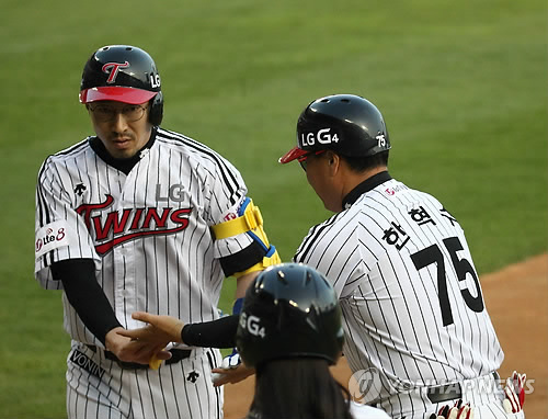| △ '동점이다' (서울=연합뉴스) 박정헌 기자 = 13일 서울 잠실야구장에서 열린 2015 프로야구 NC 다이노스와 LG 트윈스 경기. LG 정성훈이 1회말 동점 솔로홈런을 친 뒤 홈인하며 한혁수 코치의 축하를 받고 있다. 2015.5.13 home1223@yna.co.kr |