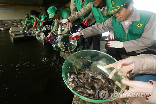 | △ 모기 천적 미꾸라지 방사 <<연합뉴스 DB>> |