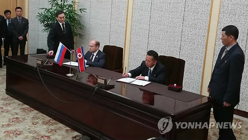 | △ 알렉산드르 갈루슈카 러시아 극동개발부 장관(가운데 왼쪽)이 지난 4월 평양에서 열린 제7차 러-북 통상경제·과학기술협력 정부 간 위원회에서 회의 결과를 담은 의정서에 서명하고 있다.(연합뉴스 자료사진) |