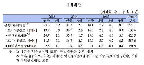 한국은행이 14일 발표한 '4월중 금융시장 동향' 자료에 따르면 지난달 말 현재 은행권 가계대출(모기지론 양도 포함) 잔액은 579조1천억원으로, 한 달 전보다 8조5천억원 증가했다.