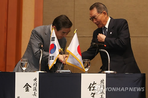 | △ 제47회 한일경제인회의 폐회 (서울=연합뉴스) 임채두 기자 = 14일 오후 서울 소공동 롯데호텔에서 열린 한일국교정상화 50주년 기념 제47회 한일경제인회의 폐회식에서 한국 단장인 김윤 한일경제협회 회장과 일본 단장 사사키 미키오 일한경제협회 회장이 악수하고 있다. 2015.5.14 doo@yna.co.kr |