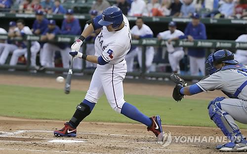 추신수는 14일(현지시간) 미국 텍사스 주 알링턴의 글로브 라이프 파크에서 벌어진 미국프로야구 캔자스시티 로열스와의 홈경기에서 1번 타자 우익수로 출전해 3회 현재 2타수 2안타를 쳤다.
