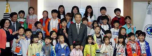 | △ (서울=연합뉴스) 정종섭 행정자치부 장관이 15일 오전 서울 종로구 정부서울청사를 찾은 대성동초등학교 학생들과 기념 촬영을 하고 있다. 2015.5.15 << 행정자치부 제공 >> photo@yna.co.kr |
