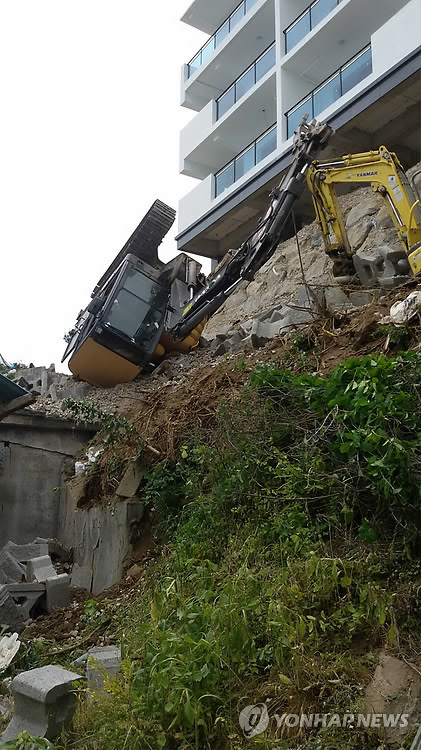 (영덕=연합뉴스) 이덕기 기자 = 15일 오전 11시 10분께 경북 영덕군 강구면 금진리 펜션 공사 현장에서 옹벽이 붕괴되면서 굴착기가 전복됐다.