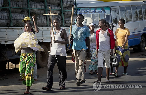 | △ 부룬디 정국 혼미 (부줌부라 AP=연합뉴스) 14일(현지시간) 부룬디 수도 부줌부라에서 시민들이 '불편부당'의 표징으로 십자가를 들고 거리를 걷고 있다. |